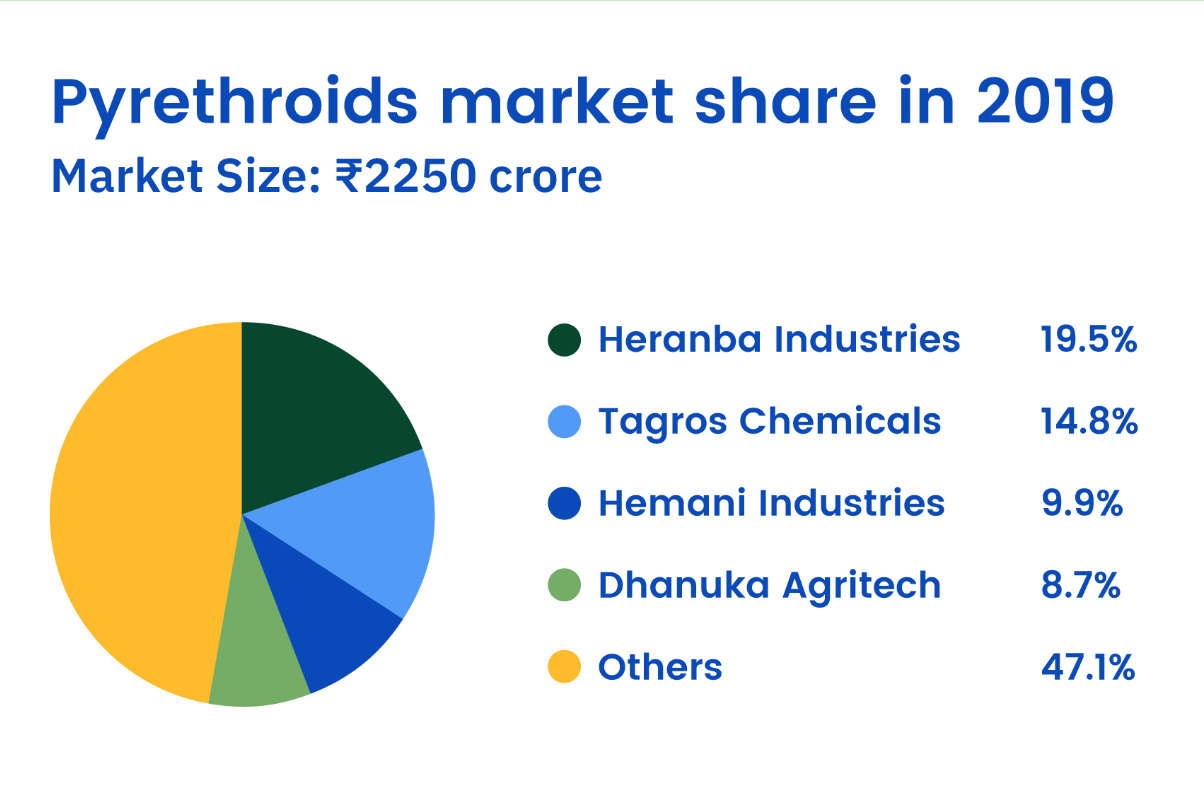 In 2019, the company was the market leader in the Indian pyrethroids market, with a market share of 19.5% of the total Indian pyrethroids production values. Second in line was Tagros Chemicals India Limited (14.8%), while Hemani Industries Limited (9.9%) was third.