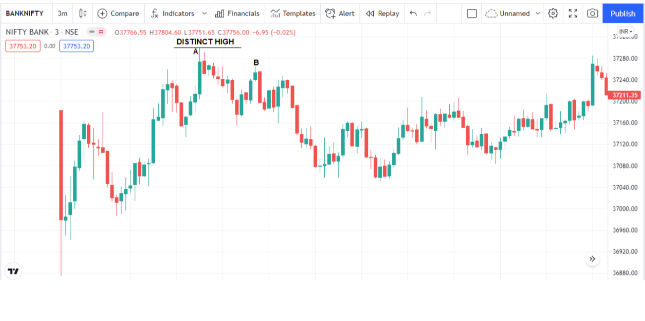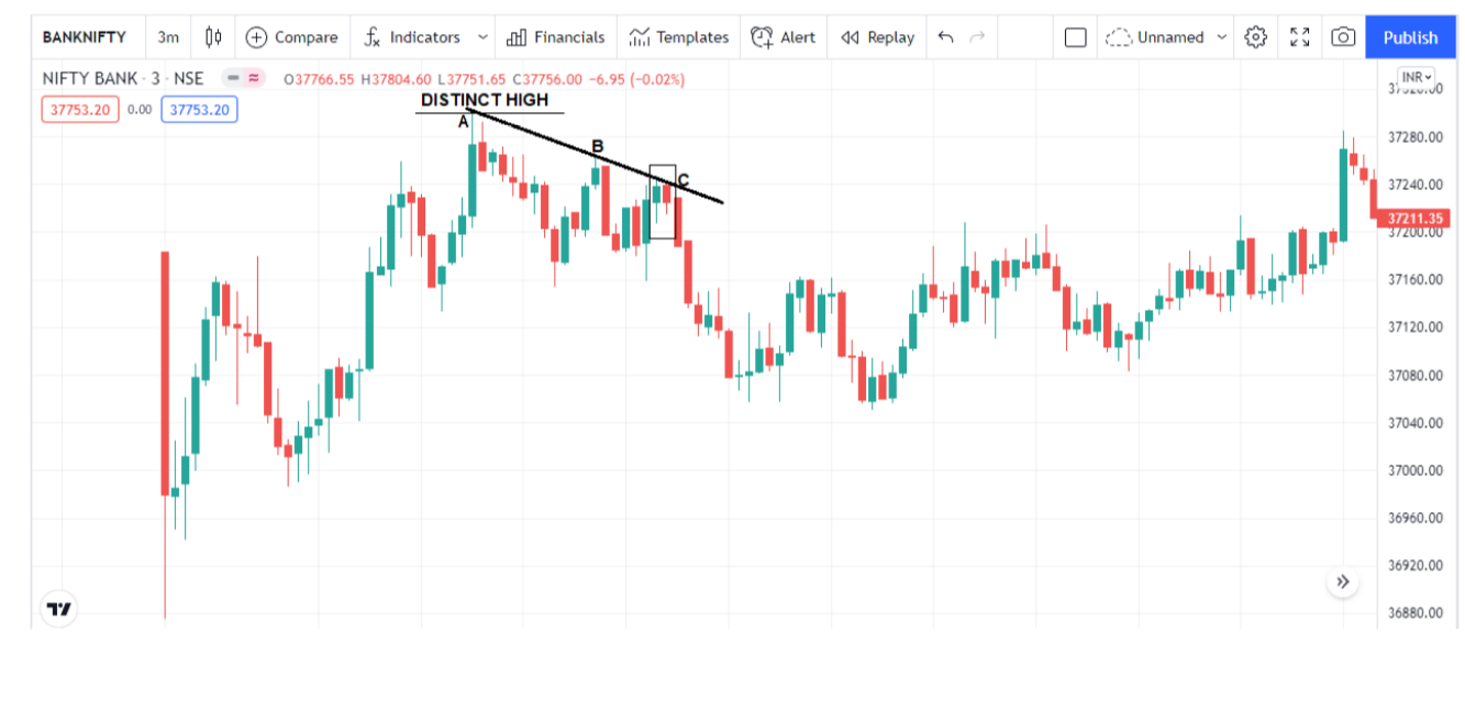 Step 1 : We have to start from a distinct high. Ofcourse, it is not impossible for us to enter at the lows and exit at the highs. We need to see the price going downwards by creating two swing highs in the process. After we get two swing highs, we can say that the price is in a downtrend. We will look at a price chart on the ** Upstox pro web** platform to understand step 1 better.