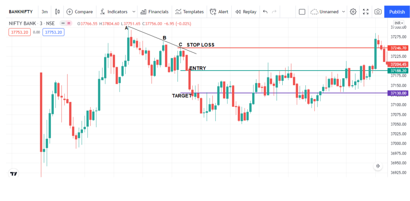 Since it’s an intraday and a quick trade, the chart timeframe being 3 minutes, we will aim for a risk to reward of 1:1. In our example, the risk being 58 points, we will aim for a target of 58 points too from our entry price which comes to 37130 (37188-58)