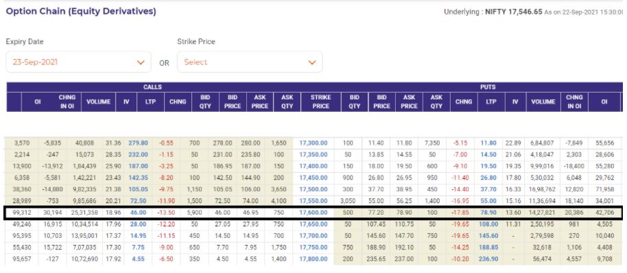 We use nseindia.com for option chain analysis. The above data gets updated every 5 mins in the live market. The above option chain data is of Nifty 22nd September (23rd September expiry)