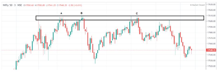 In the chart above we can see the price kept moving down everytime it came near 17600-17610 zones marked in black box. It also formed a triple top price action pattern where price rejects from a particular zone not once but three times before eventually going down even further.