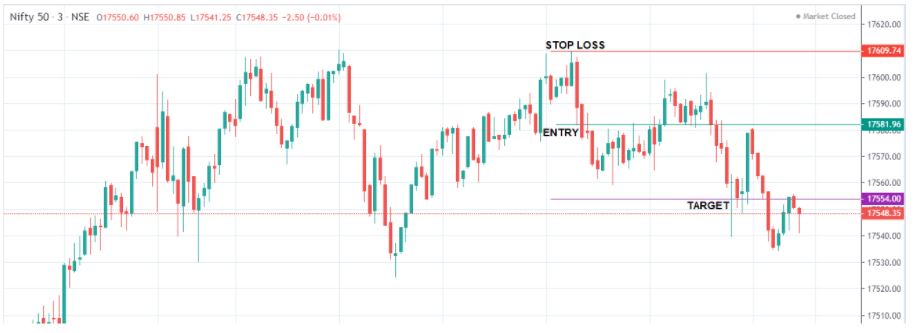You can see the GREEN line (17581.96) that's where the bearish engulfing pattern was formed after the triple top pattern .That is our entry point. We will enter around those levels at 17582. Since Nifty spot can’t be traded, you can look to trade Nifty futures or options**.** If you choose to trade options, one way to go about it is that you can buy an ATM (at the money) strike price put option to trade. The market price is 17582 in our example and the nearest strike price seems to be 17600 put option. So, 17600 becomes our ATM strike (at the money). Since it’s an intraday trade, you can go for weekly expiry rather than a monthly expiry contract.