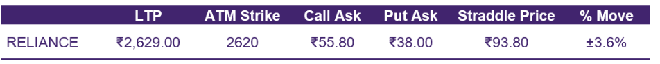 If a stock is optionable, then a F&O trader can potentially take advantage of these events. If a trader only focuses on the Nifty or Bank Nifty, they would completely miss out on these trading opportunities. Below is information on Reliance that will announce earnings soon. If you look at the price of the straddle – the simultaneous purchase of an at-the-money call and put – this tells you what the option market is implying in terms of an up or down price move. Based on this data for Reliance, the implied move is +/