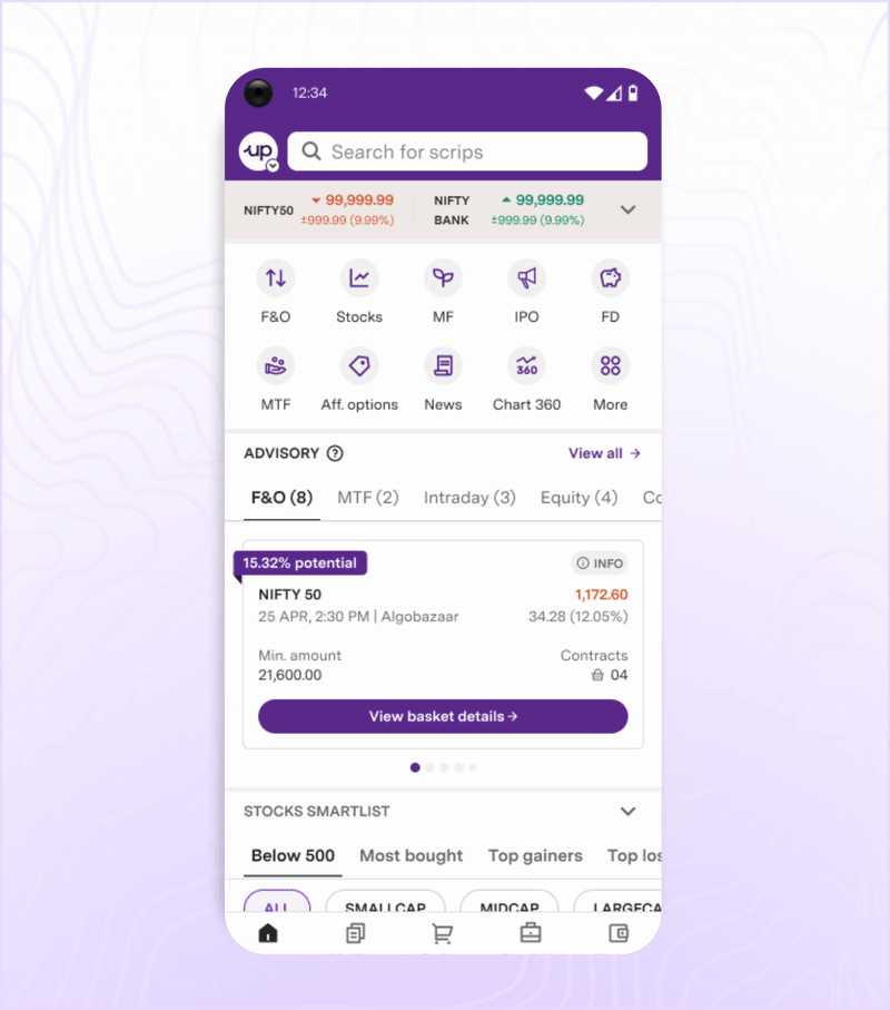 Helps you: Execute expert-built F&O baskets, manage risk, and simplify your entire F&O trading experience.
