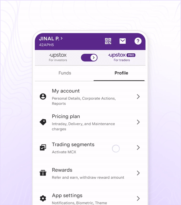 👉 If you’re already using new Upstox app (purple): Directly go to ‘Accounts’ tab at the bottom of the screen. Switch the toggle button to ‘Upstox Pro’ from the top of the screen.