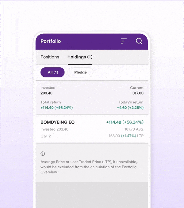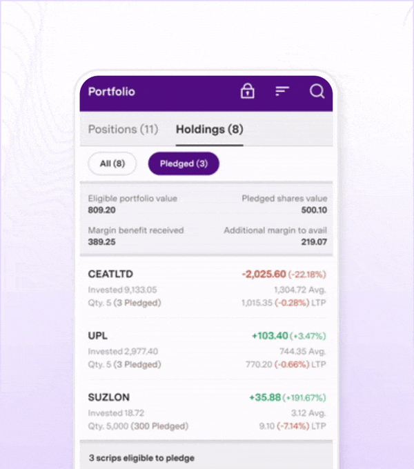 With our revamped Margin Pledge, you pledge your holdings and avail up to 100% collateral margin against Stocks, ETFs and SGBs for F&O trading. As per regulations, a 50:50 ratio between Cash and Collateral is required. However we have enabled 100% collateral without the need to maintain this ratio. All you need to do is pay a nominal interest of 0.05% per day which will be applicable on the amount of cash margin shortage according to the 50:50 cash collateral ratio.