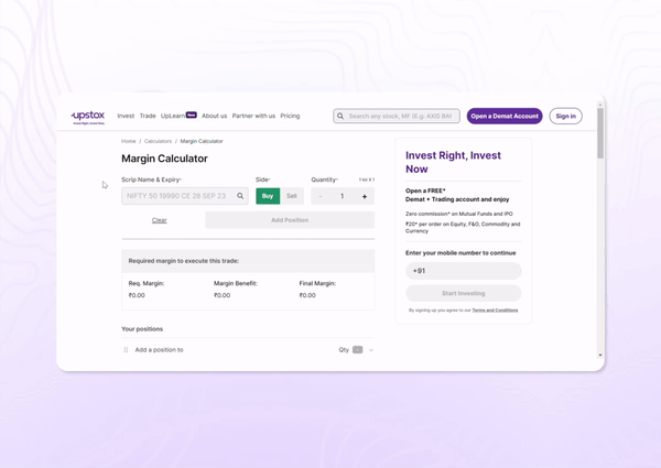 Now enjoy our revamped free calculator for checking margin requirements for F&Os strategies. Our revamped Span Calculator is a game-changer, simplifying the process of margin calculation for your trades. You can now get a very detailed breakdown of your margin requirements to the level of margin break-up per each leg of order placed. Additionally, also find out margin based on the sequence of when you are planning to execute each leg of your order (applicable only in multi-leg orders). This will help you plan your trades much better.