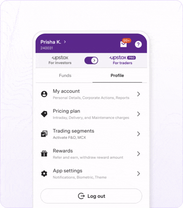 👉 If you’re already using new Upstox app (purple): Directly go to ‘Accounts’ tab at the bottom of the screen. Switch the toggle button to ‘Upstox Pro’ from the top of the screen.