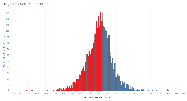This is a chart of 8-day Nifty returns over the last 15 years. Using this data, we can see how often outcomes have happened historically. Looking at the long call trade, how often does the Nifty move more than the break-even return of 1.1% (market close-to-market close) over an 8-day period? Around 38% of the time. The blue in the chart below represents historical times when this occurred.